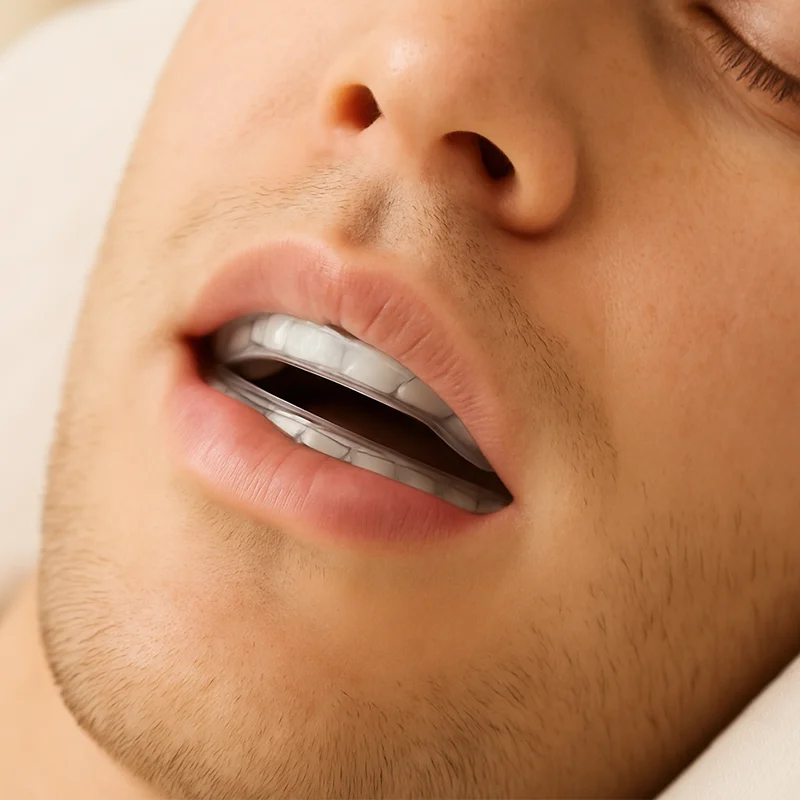 Schnarchen entsteht oft durch das Zurückfallen des Unterkiefers im Schlaf. Unsere individuell gefertigten Protrusionsschienen halten den Unterkiefer leicht vorn – so bleibt der Rachenraum offen, die Atmung wird freier und das Schnarchen deutlich reduziert.